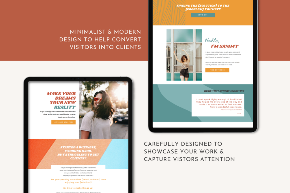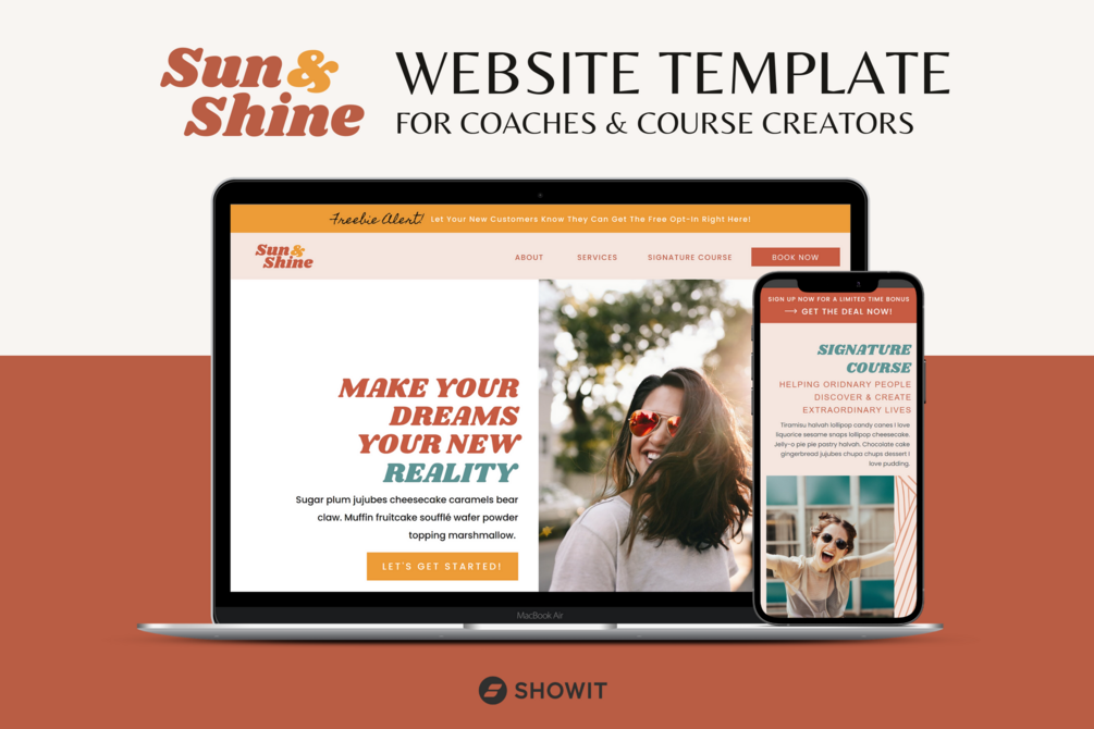 The Sunshine Showit website template is specifically designed for coaches and course creators, to help showcase your services and sell your signature course or product with a strategically designed long form sales page. Easily edit this modern Showit template with your business' style and create a website that turns visitors into clients.